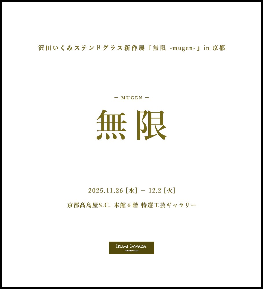2025年小雪の候、京都髙島屋S.C.(京都)にてステンドグラス作家・沢田いくみの新作展『無限 -mugen-』を開催いたします。
