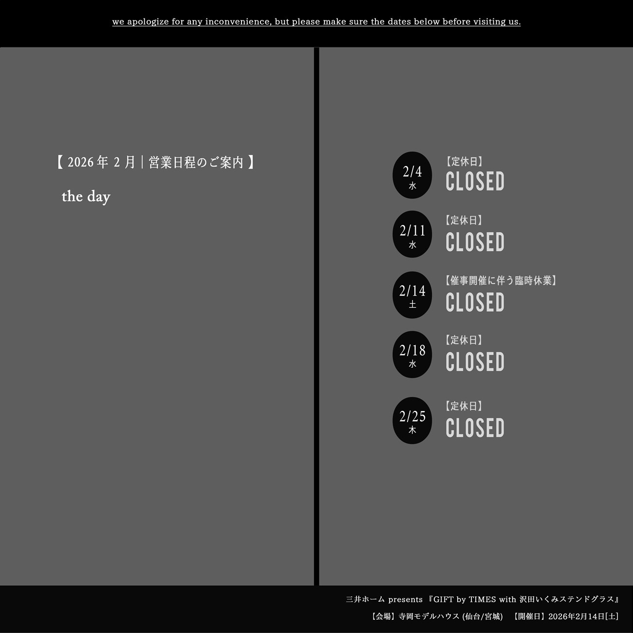 ▶2026年2月:定休日・水曜日に加え、2/14(土)を臨時休業とさせていただきます。